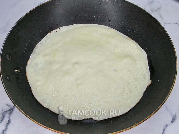 Сковородку смазываем оливковым маслом, сильно разогреваем, пока не пойдёт лёгкий дымок. Вливаем в горячую сковородку примерно 2 столовые ложки теста, немного наклоняем её, чтобы тесто равномерно растеклось по дну. Жарим, пока тесто сверху не станет матовым, края слегка не подсохнут, а блин не будет легко отставать от сковородки. В зависимости от вашей плиты и толщины сковороды на это уйдёт примерно 1,5-2 минуты.