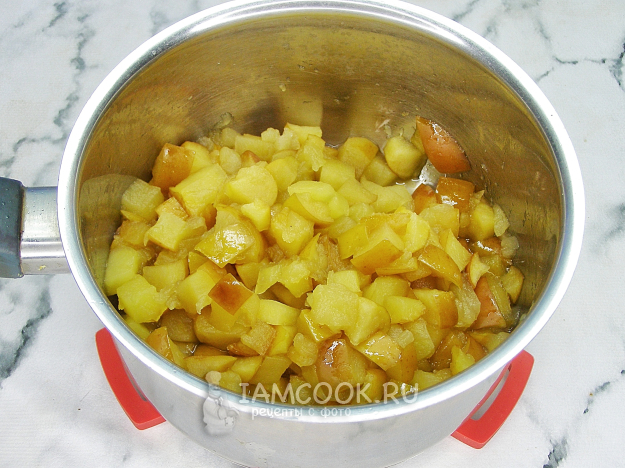 На сильном огне доводим до кипения, затем тушим на слабом огне под крышкой минут 15, пока яблоки не размягчатся.