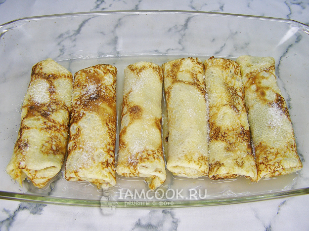 Выкладываем в форму, смазанную растительным маслом. Сверху немного присыпаем сахаром. На дно формы можно налить чуть-чуть водички или сиропа, так блины не подсохнут.