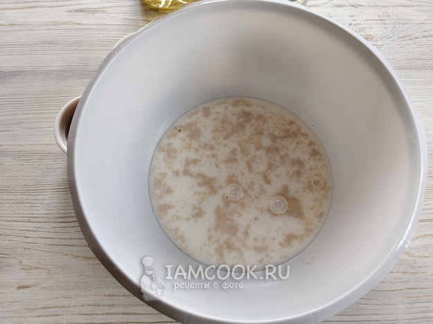В теплом молоке растворить сахар и дрожжи.