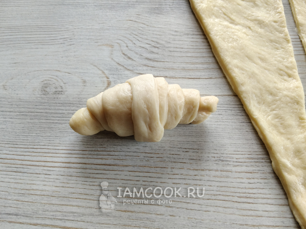 Закрутить тесто от большего края, слегка подтягивая, чтобы оно было тоньше и получилось больше витков.