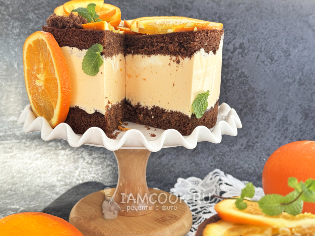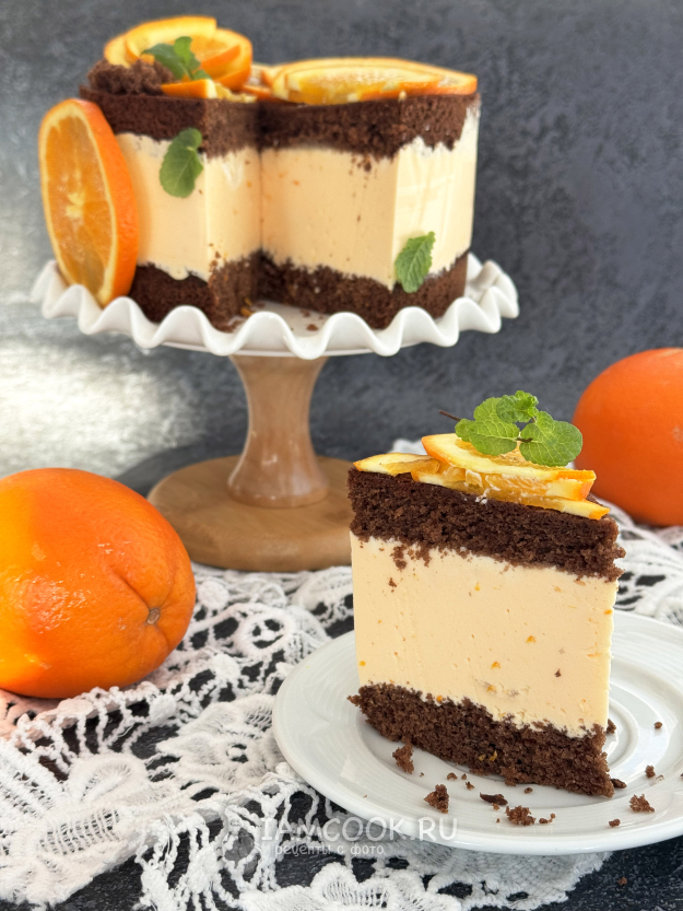 Посмотрите, какой яркий и красивый торт с апельсиновым суфле получился. Я украсила верх торта ломтиками апельсина и веточками мяты.