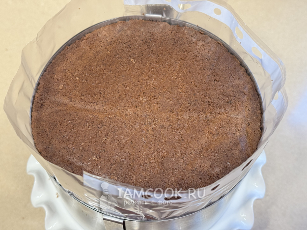 Один корж положить на дно разъемной формы (диаметр - 16 см). По желанию стенки бортика выстелить пленкой или файликами.