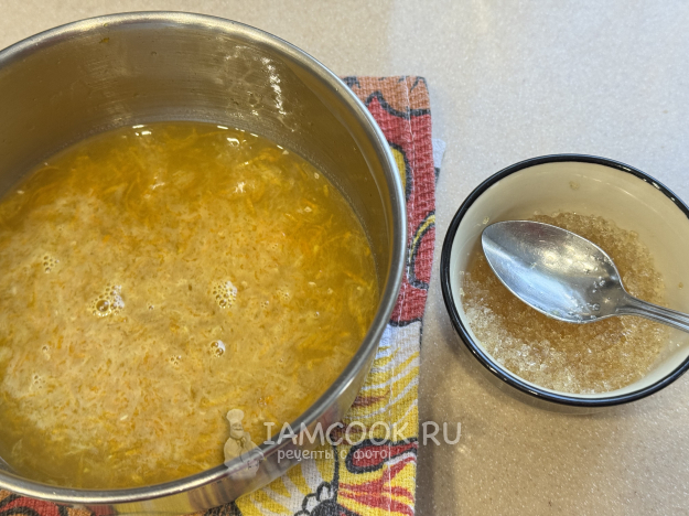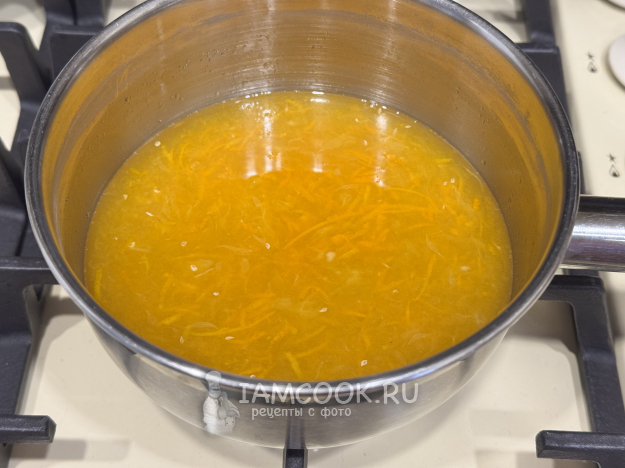 В сотейник с сахаром и цедрой влить апельсиновый сок и поставить на огонь.
