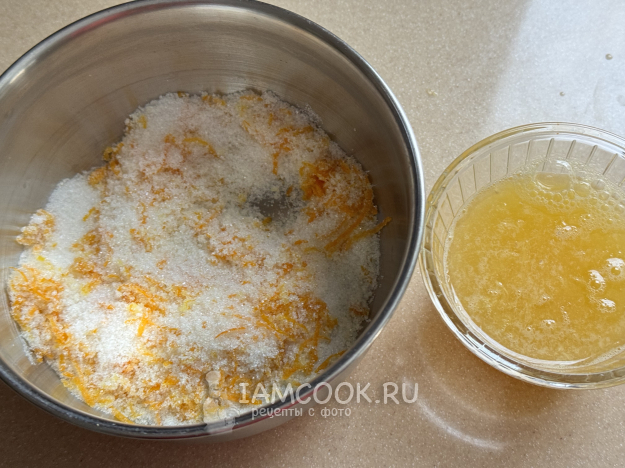 В сотейник всыпать сахар и добавить цедру. Перетереть цедру с сахаром. Из апельсина выдавить сок, у меня получилось 170 мл чистого сока. Желатин предварительно залить водой и оставить набухать.
