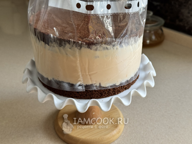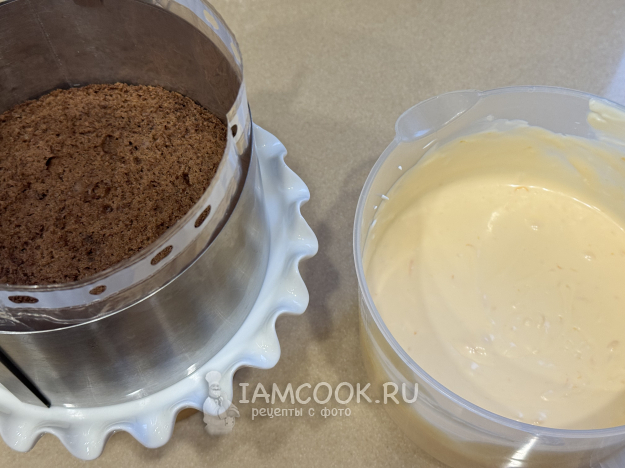 Накрыть вторым коржом. Слегка прижать корж, чтобы он сцепился с суфле. Накрыть форму тарелкой и убрать торт с суфле в холодильник на ночь.