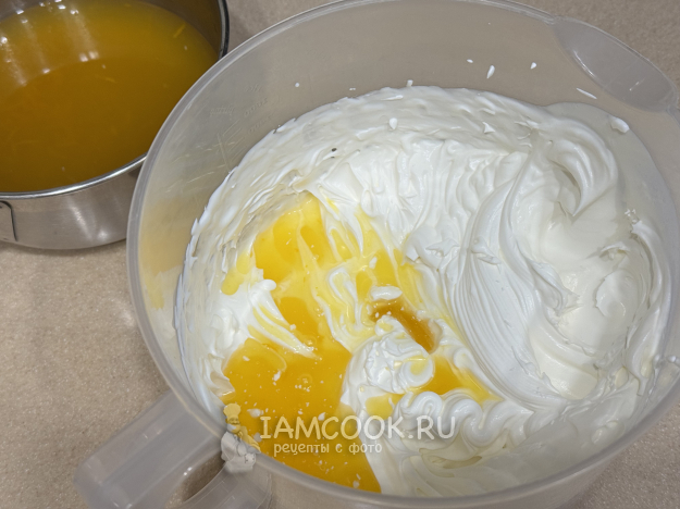 В сливки влить апельсиновую массу, она должна быть комнатной температуры. Вводить массу в три приема, перемешивая суфле венчиком.