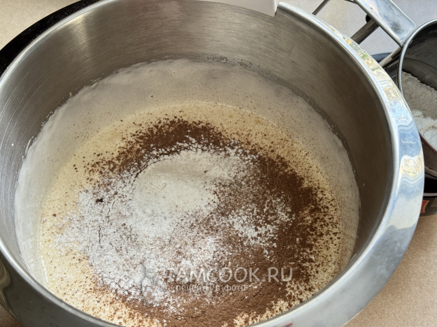 Добавить растительное масло и перемешать лопаткой. Затем всыпать просеянную муку, какао и разрыхлитель.