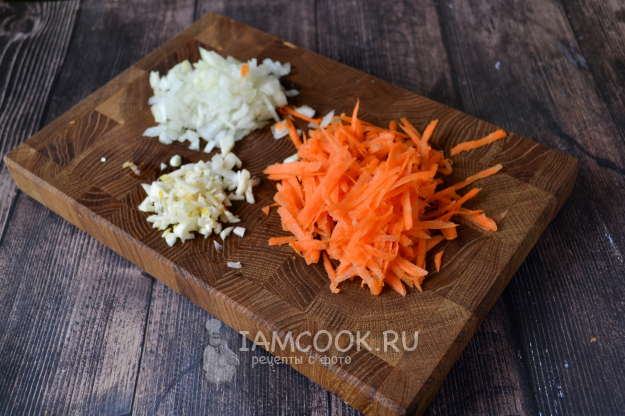 Морковь, лук, чеснок вымойте, почистите и еще раз вымойте. Лук и чеснок мелко нарежьте, морковь натрите на терке.
