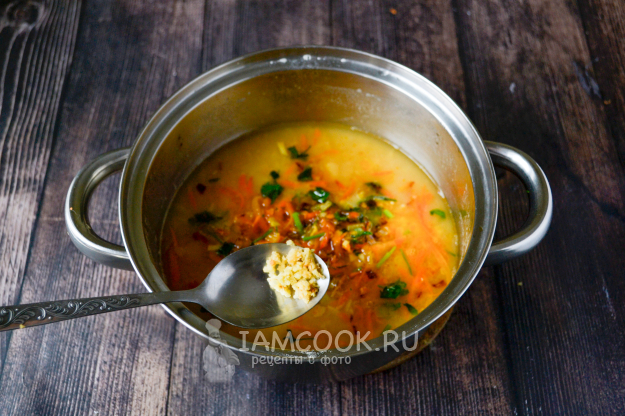 В кастрюлю с горохом положите обжаренные овощи со сковороды, добавьте натертый имбирь, соль, тмин. Доведите суп до кипения, проварите 3-5 минут.