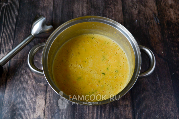 Погружным блендером пюрируйте суп. Можно пробить до полностью однородной консистенции, я же измельчила слегка, чтобы чувствовались небольшие кусочки овощей.
