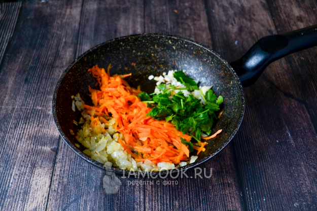Морковь обжарьте 5-6 минут, добавьте чеснок.