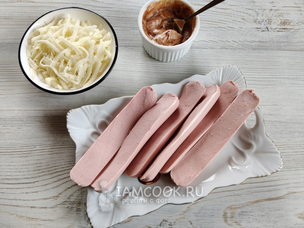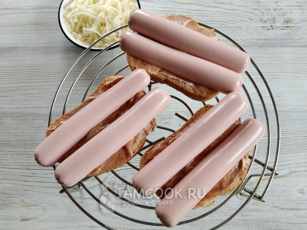 Положить сверху сосиски.