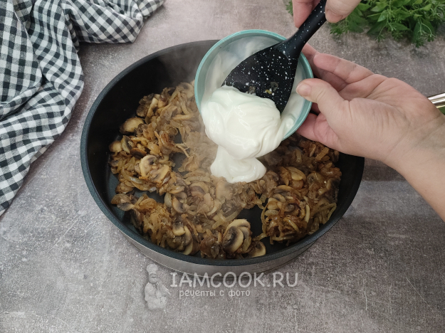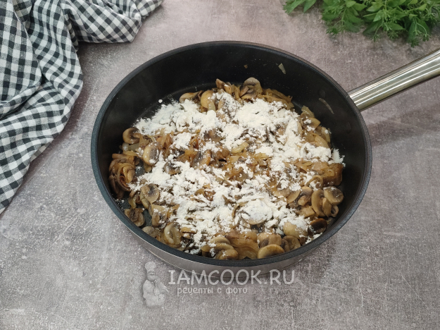 Добавьте к луку грибы, обжарьте до испарения лишней влаги, дайте грибам немного подрумяниться. Всыпьте муку. Обжаривайте муку с грибами, луком, постоянно помешивая, не должно остаться белых мучных вкраплений.