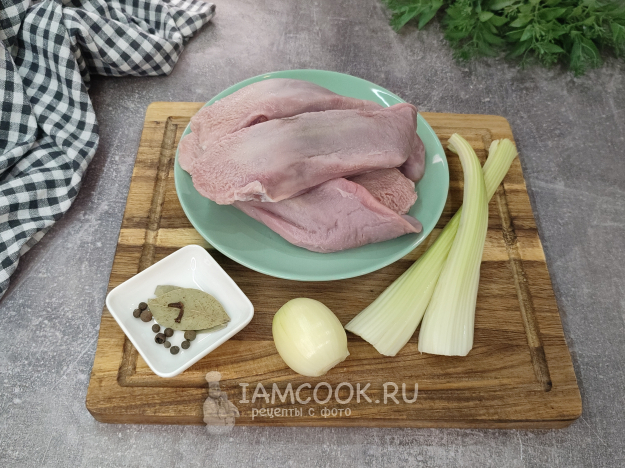 Соберите необходимые ингредиенты для бефстроганова из языка. Начнём с варки языка. У меня язык сегодня свиной, подойдет, конечно же, и говяжий, но варить говяжий язык требуется минут на 30 дольше свиного, в остальном отличий нет.