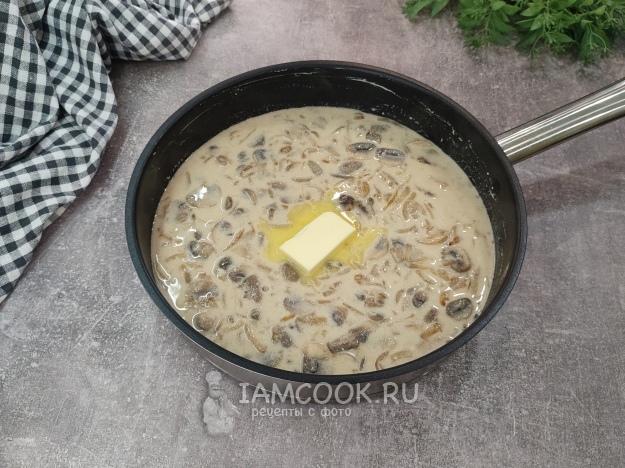 Влейте бульон, который мы процедили ранее, добавьте сливочное масло, проварите все вместе пару минут.