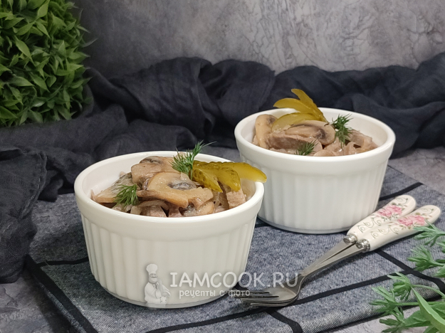 Бефстроганов из языка можно подать как горячую закуску в рамекинах или соусниках подходящего размера, украсив зеленью и соленым огурчиком, например.