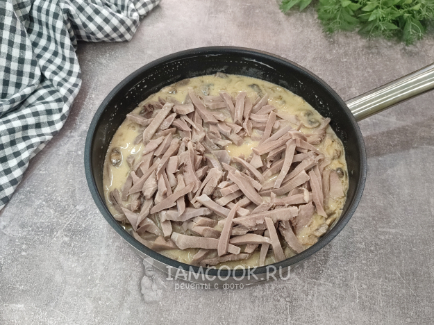 В соус выложите нарезанный язык, перемешайте, добавьте по вкусу соль, перец.