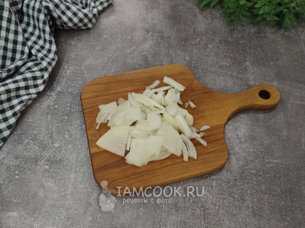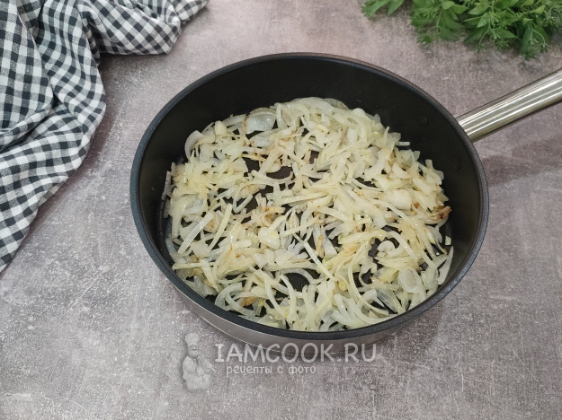 В сковороде разогрейте растительное масло, обжарьте до мягкости и легкой золотистой корочки лук.