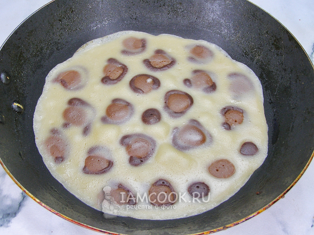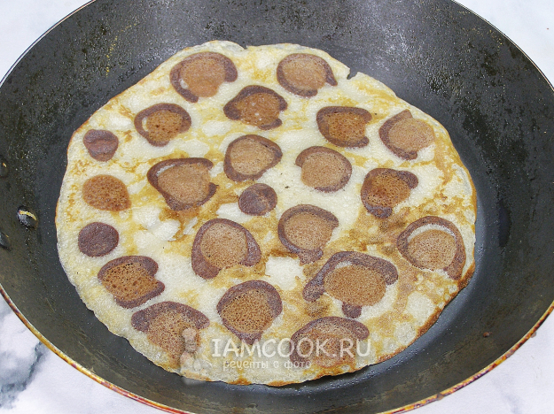 Сковородку смазываем небольшим количеством растительного масла и разогреваем её на огне выше среднего, но не на максимуме. На дно с помощью бутылочки для соуса или чайной ложкой наливаем пятна из светло-шоколадного теста, обводим тёмно-шоколадным. Обжариваем примерно 30 секунд, чтобы тесто схватились.