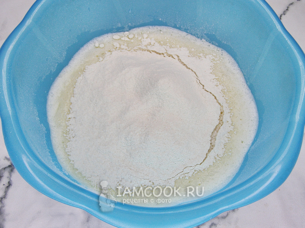 Просеиваем в смесь муку и тщательно перемешиваем венчиком, чтобы не осталось комочков. По консистенции готовое тесто должно получиться как жидкая сметана. Если тесто получается густым, можно добавить немного молока, если жидким - подсыпать чуточку муки.