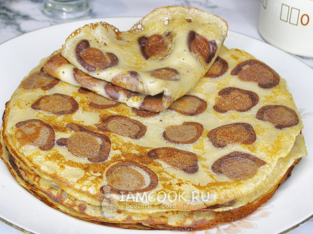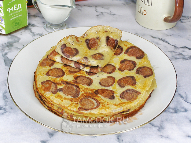 Таким образом жарим все блины, пока не закончится тесто. Готовые блинчики перекладываем на тарелку, один на другой, и накрываем глубокой тарелкой или миской, чтобы они не остывали. Подаём леопардовые блины в тёплом виде, очень вкусно со сметаной, мёдом и сгущёнкой. Приятного аппетита!