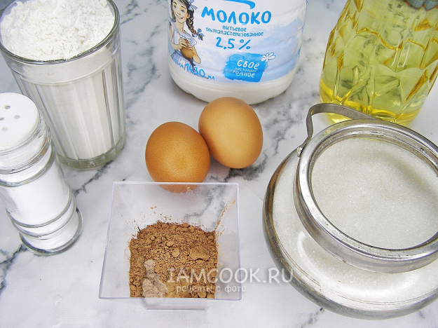 Соберём продукты для приготовления леопардовых блинов на молоке. Яйца и молоко лучше заранее достать из холодильника, чтобы они согрелись до комнатной температуры. Также для приготовления таких блинов вам понадобится одна или две бутылочки для соуса с тонким носиком, с их помощью будет удобно рисовать тестом пятнышки.