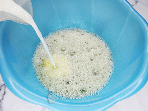 Вливаем молоко и продолжаем взбивать.