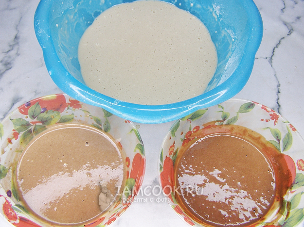 Делим тесто на три части. В одну миску переливаем два половника теста, в другую - один. В большую миску добавляем 1 чайную ложку какао-порошка; в миску, где два половника теста, кладём 2 ч.л. какао; в третью (где меньше всего теста) - 4 ч.л. какао-порошка.
