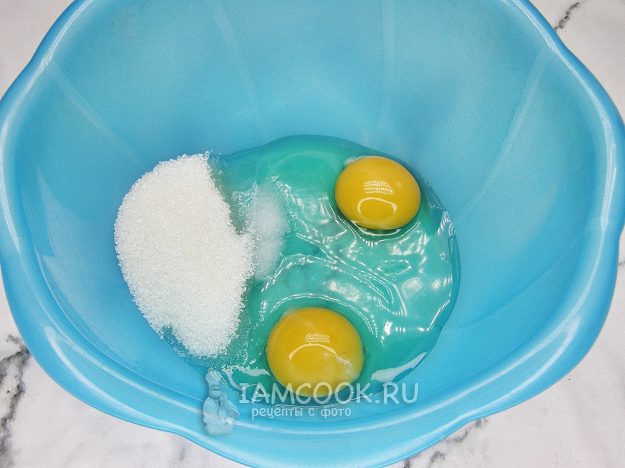 В миску разбиваем яйца, добавляем сахар, соль и взбиваем венчиком до однородности.