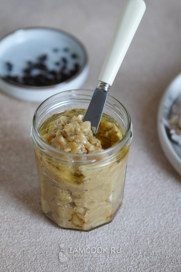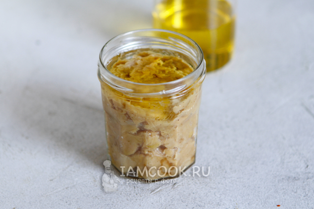 Переложите пасту из чеснока в банку и влейте оливковое масло (я добавила примерно 60 мл).