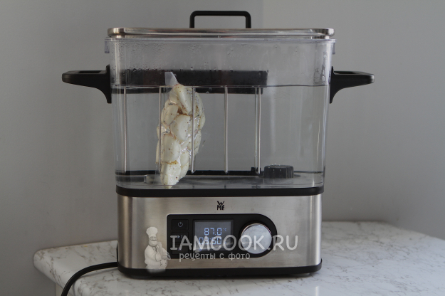 Нагрейте воду до 87 градусов. Когда вода нагреется до нужной температуры, опустите пакет с чесноком и готовьте чеснок сувид 4 часа.