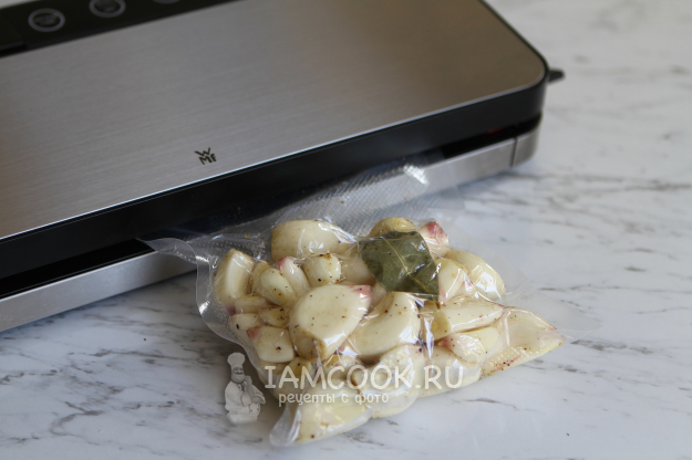 Чтобы не пачкать лишнюю посуду, можно сразу зубчики чеснока переложить в пакет, добавить специи и масло. Добавьте лавровый лист и запечатайте пакет при помощи вакуумного упаковщика, откачав лишний воздух.