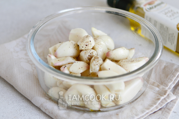 Добавьте немного соли, черного молотого перца и оливковое масло. Перемешайте чеснок со специями.