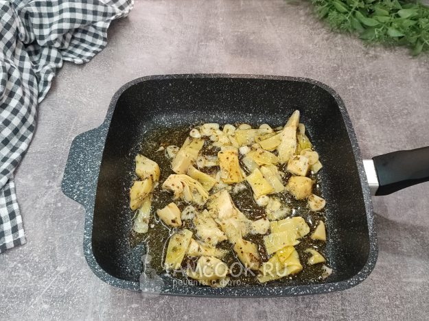 Добавьте артишоки, прогрейте все вместе пару минут.