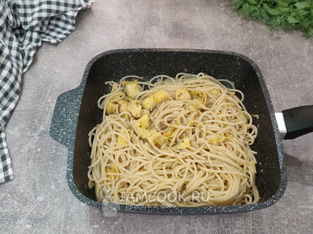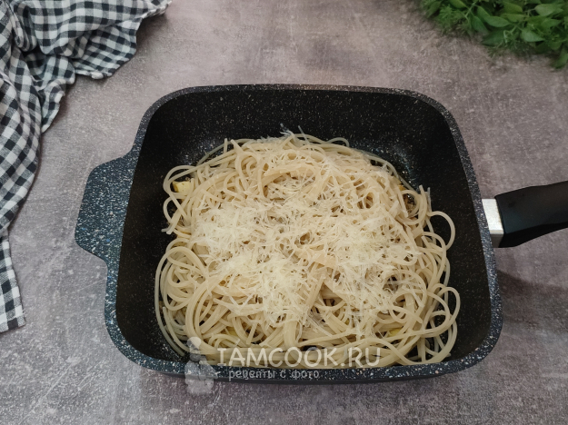 Пасту отварите согласно инструкции на упаковке, откиньте на сито и, не промывая, добавьте в сковороду. Сразу добавьте и натертый сыр.