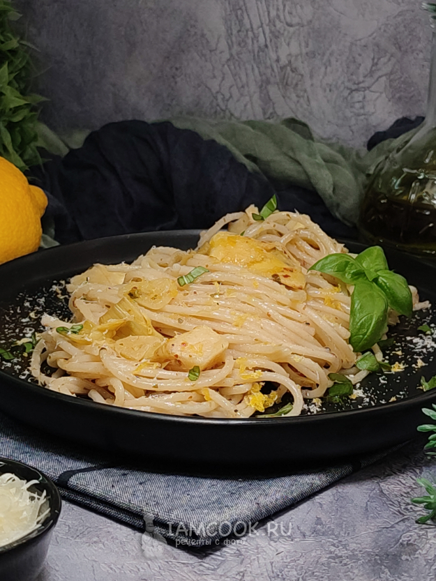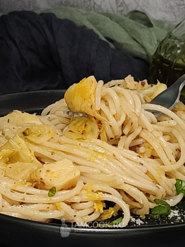 При подаче пасту с артишоками можно дополнительно сбрызнуть оливковым маслом, припорошить пармезаном, свежим базиликом.