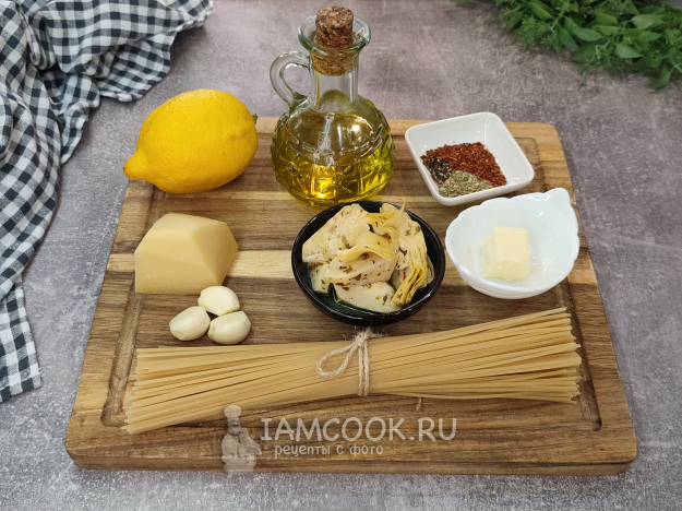 Соберите ингредиенты для приготовления пасты с артишоками. Артишоки у меня консервированные (едва ли я когда-нибудь найду в Сибири свежие 🤷♀️), пасту я выбрала длинную, любимые спагетти, и они для данного рецепта подходят идеально. Острый перец добавляйте по желанию, конечно, но он здесь весьма хорош! Соус готовится за считанные минуты, поэтому сначала поставьте воду для пасты на плиту, посолите, пусть закипает.
