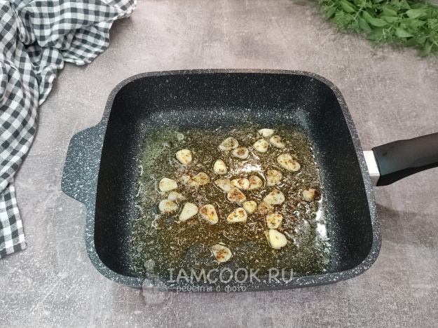 В сковороде на смеси масел на среднем огне обжарьте чеснок и специи.