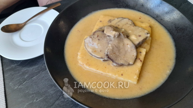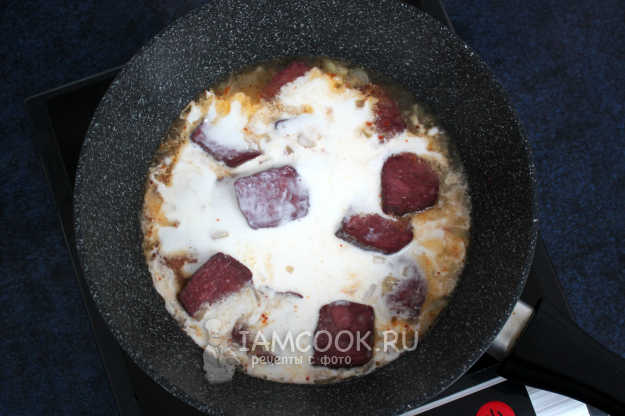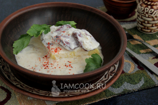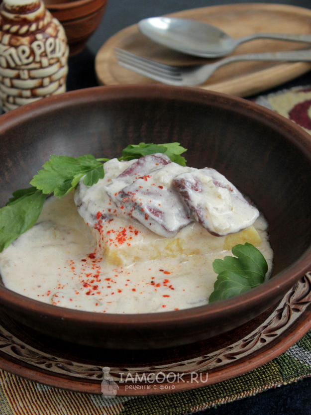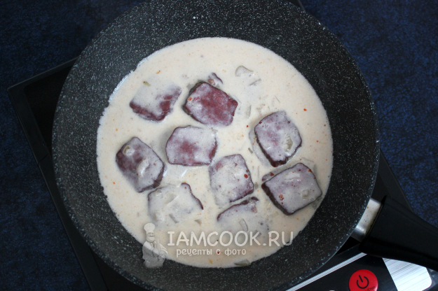 К практически уже мягкому мясу влейте сметану и муку, размешанные с водой или молоком.