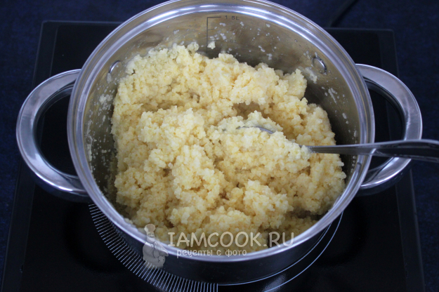 Минут через 15-20, т.е. когда пшенка подразварится, вмешайте кукурузную муку или манку. Скорее всего, понадобится подлить еще воды!