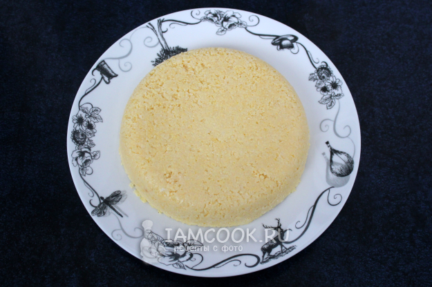 Потом эту густую массу перевалите в ёмкость подходящего размера, чтобы высота каши оказалась 2-3 см или такой, как вам удобно потом нарезать и подавать. Разровняйте, смажьте маслом или проложите пищевой плёнкой. После остывания она плотно слипнется и застынет как надо.