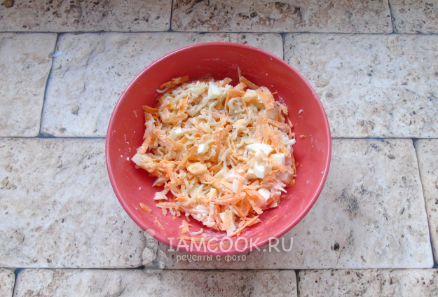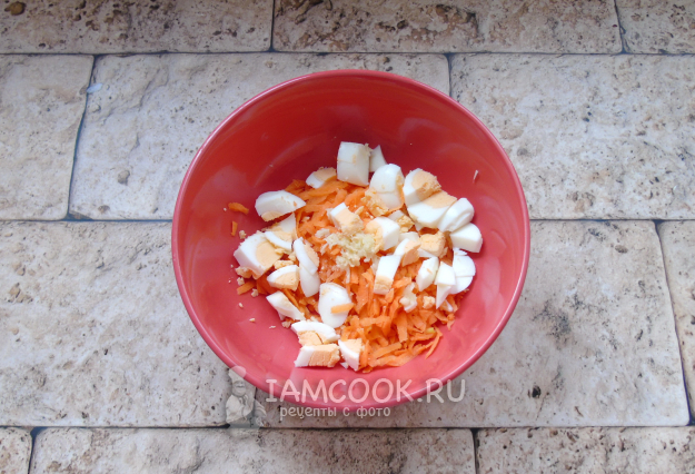 Морковь очистите, помойте и натрите на терке с крупными отверстиями. Добавьте измельченный любым способом чеснок.
