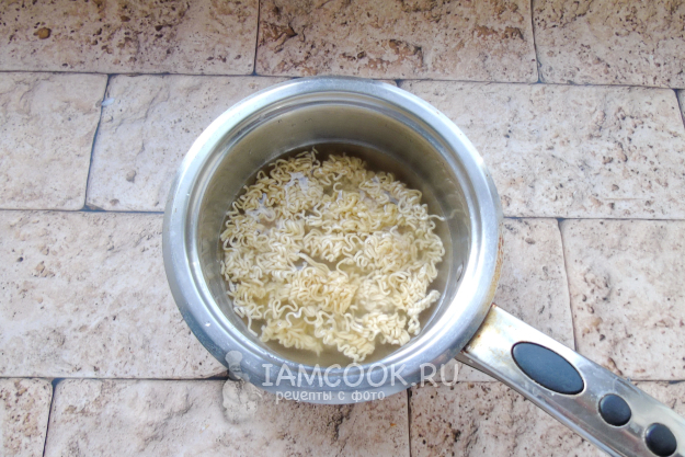 Лапшу быстрого приготовления поломайте на небольшие кусочки, поместите в кастрюлю или глубокую миску. Залейте кипятком, накройте крышкой и дайте постоять 5-6 минут.