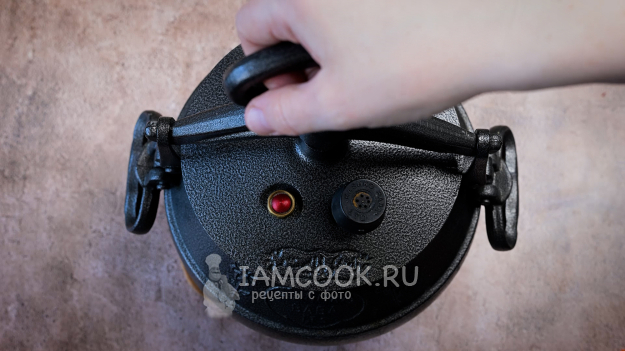 Герметично закройте казан крышкой и поставьте сначала на максимальный огонь - дождитесь, как из клапанов пойдет пар. И уже как пошел пар, сразу убавляйте огонь до умеренного (чуть больше, чем минимальный уровень) - готовьте фасолевый суп в афганском казане в течение 35 минут.