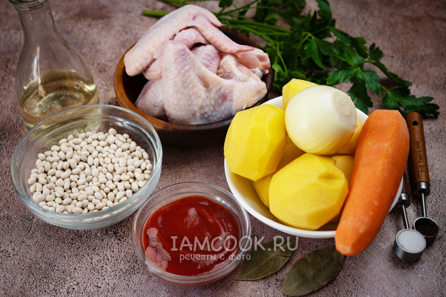 Все необходимые ингредиенты для приготовления фасолевого супа в афганском казане соберите на столе по указанному списку. Все овощи почистите и помойте.