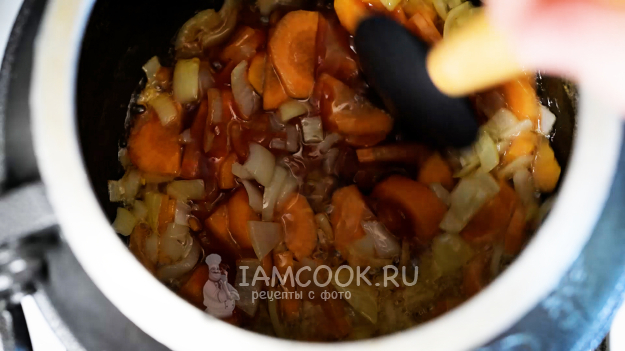 На дно казана залейте растительное масло и выложите морковь и лук. Добавьте к ним томатный соус и все вместе обжаривайте на среднем огне 8-10 минут при открытой крышке, регулярно помешивая лопаткой.