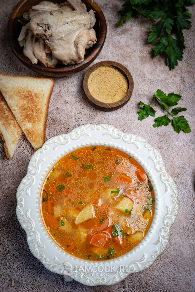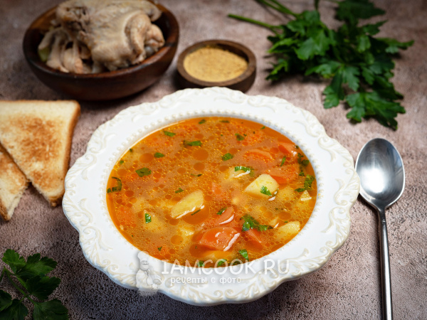 Через указанное время выключите нагрев и только через 5 минут уже открывайте крышку казана - должно сойти внутреннее давление. Горячий суп разложите по порционным тарелкам и подавайте к столу, присыпав по вкусу мелко порубленной свежей зеленью. Приятного аппетита!