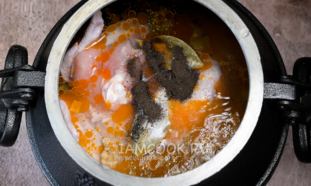 Залейте воду, добавьте соль и перец. Афганский казан не должен быть заполнен больше чем на 2/3 от общего объема!