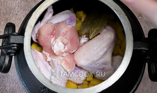 Затем к обжаренным овощам выложите фасоль, картофель, куриные части (у меня крылышки), лавровые листики.